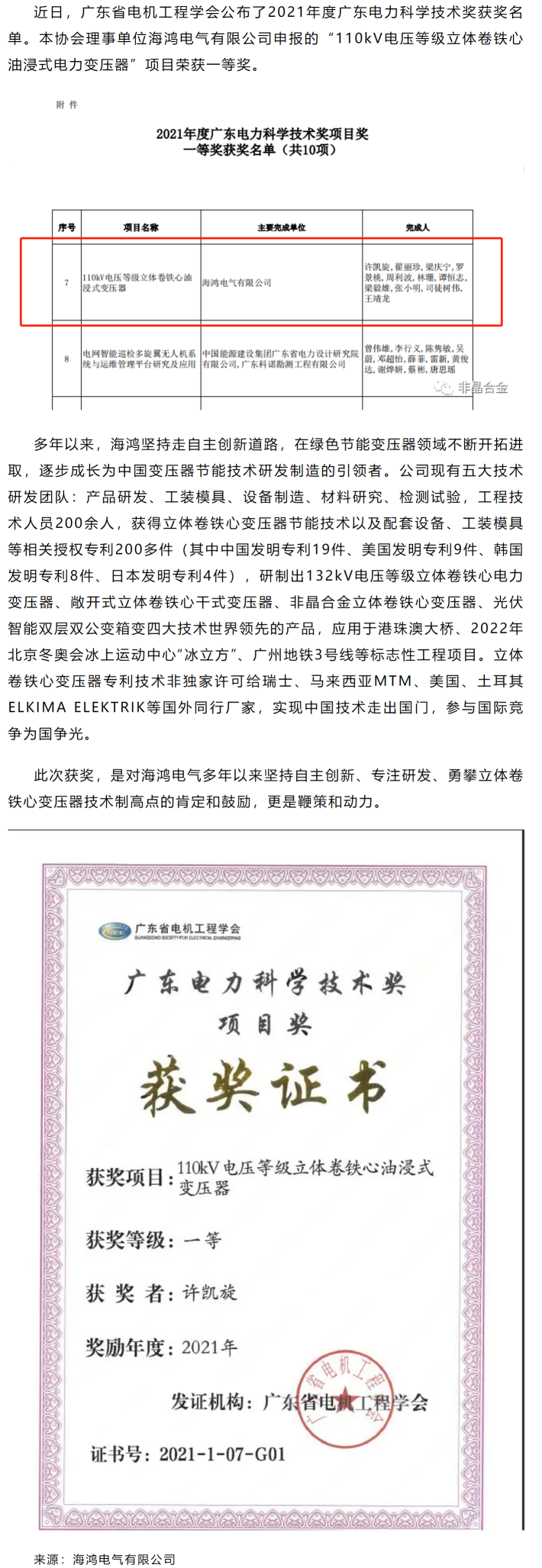 海鸿电气荣获2021年广东电力科技奖一等奖!