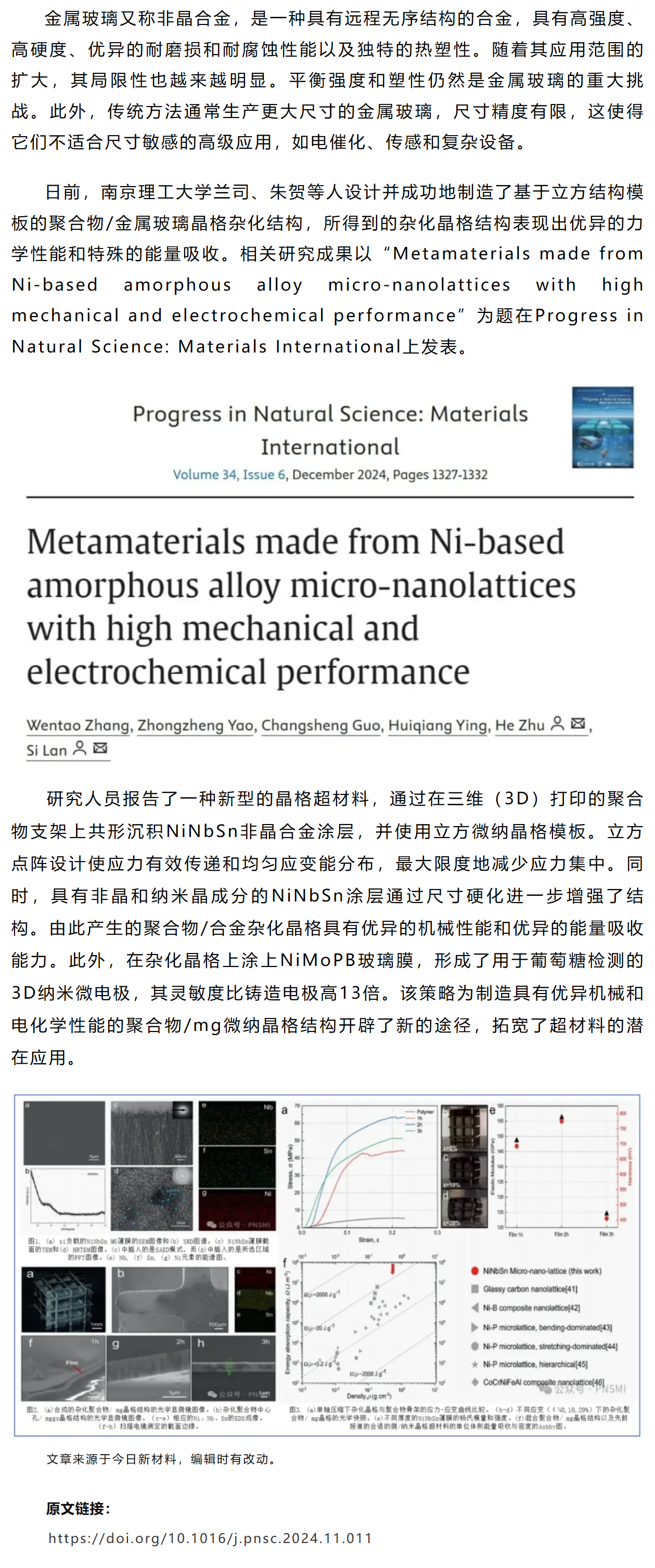 PNSMI|南理工兰司朱贺等工作:由镍基非晶合金微纳晶格制成的具有高机械性能和电化学性能的超材料