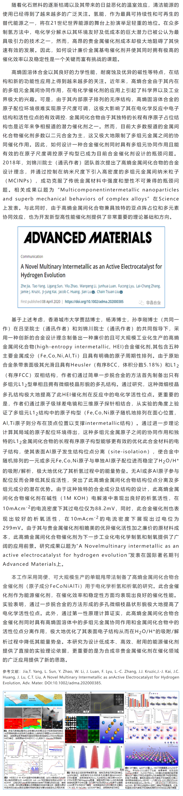 香港城市大学吕坚与刘锦川团队Adv. Mater.工作 :首次研发廉价多组元高熵金属间化合物用于高性能电化学能源催化剂