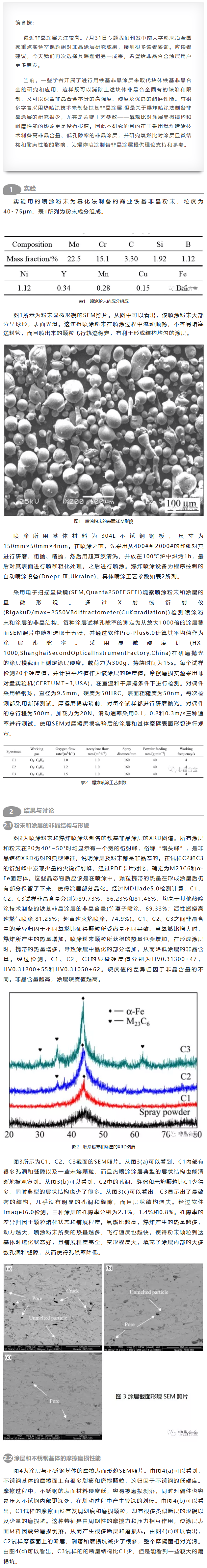 这个关键工艺参数很重要!它对爆炸喷涂铁基非晶涂层结构和摩擦磨损性能有重要影响