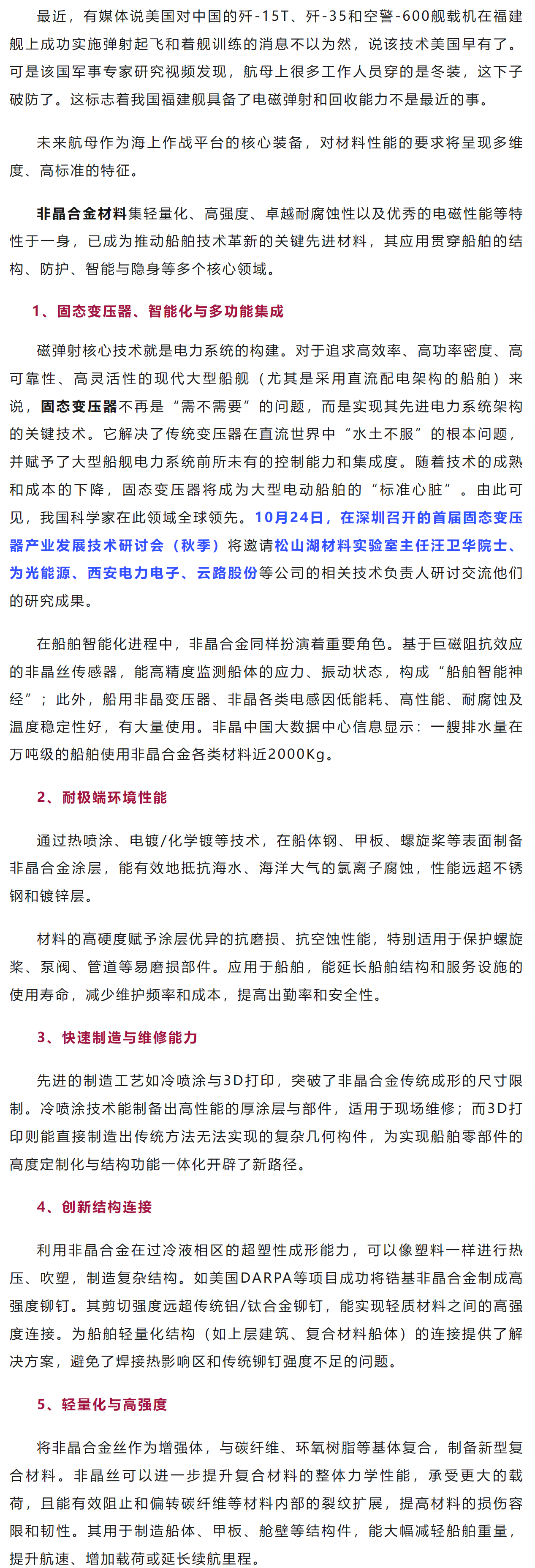 福建舰上战斗机弹射成功 非晶合金材料能否走上甲板秀一秀?