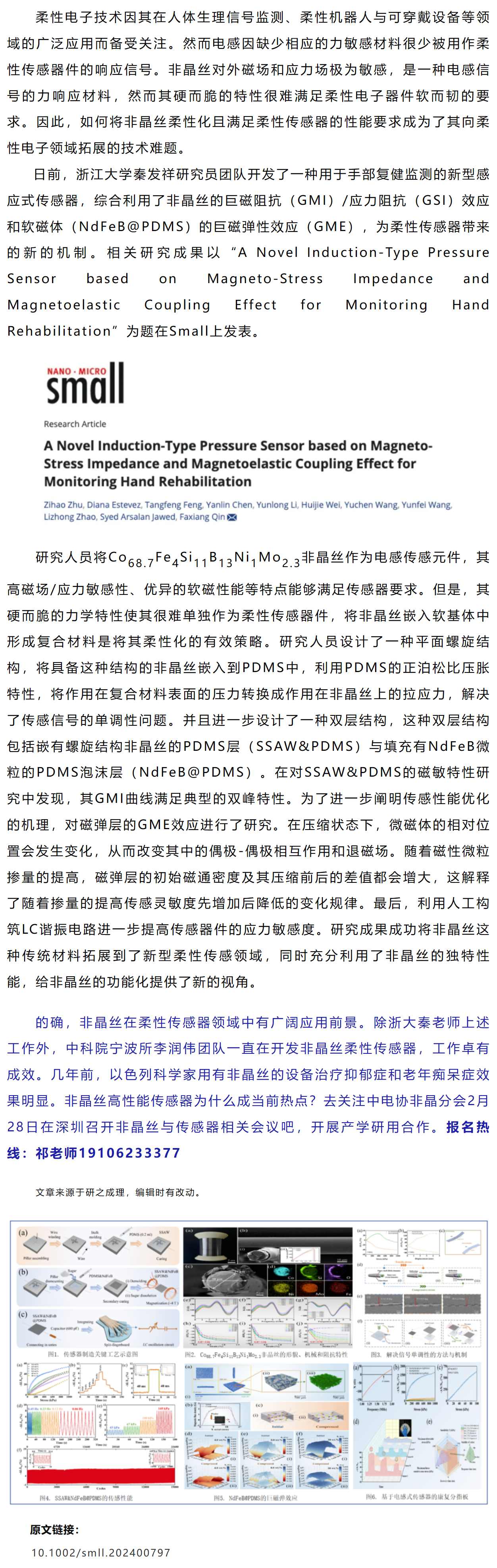 《Small》浙江大学秦发祥团队: 基于磁-应力阻抗和磁弹耦合效应的新型感应式手部康复压力传感器