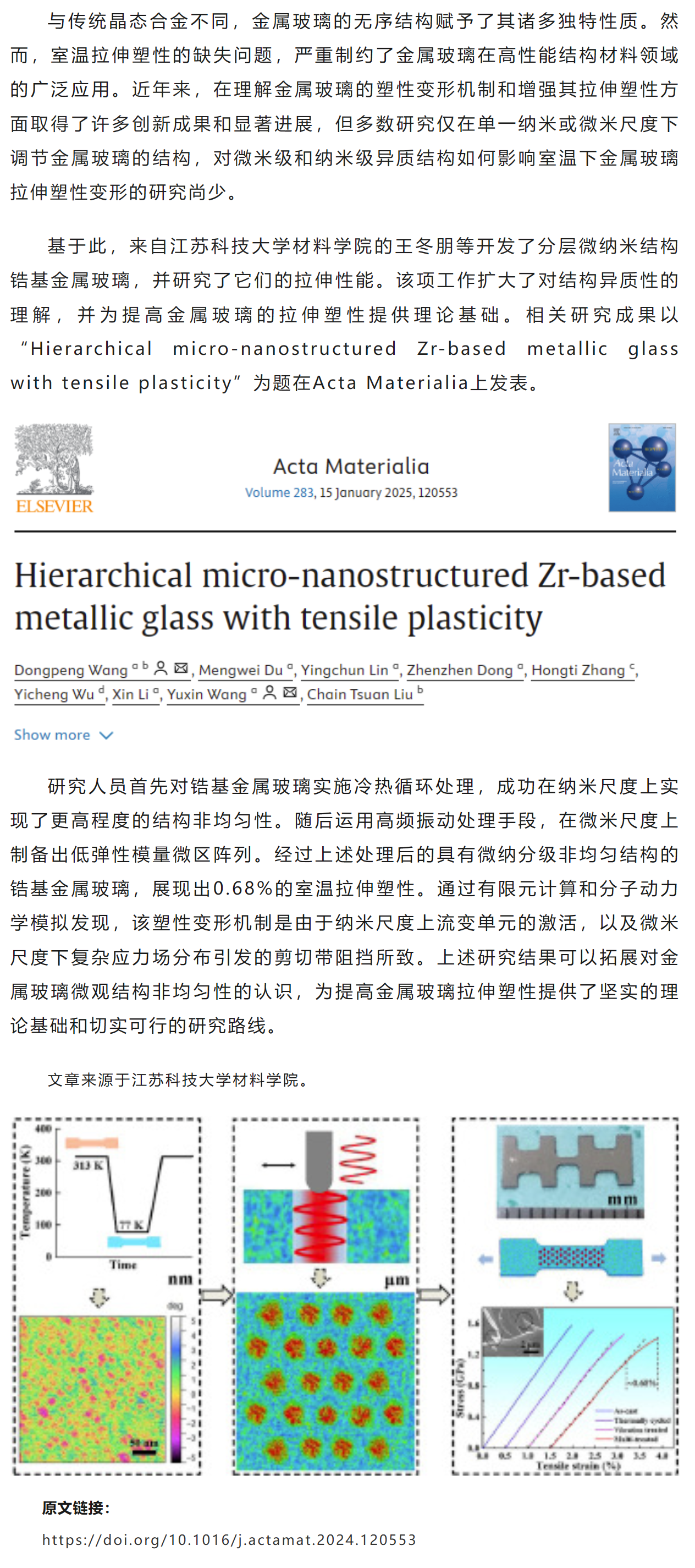 《ACTA MATER》王冬朋等工作:具有拉伸塑性的分层微纳米结构Zr基金属玻璃