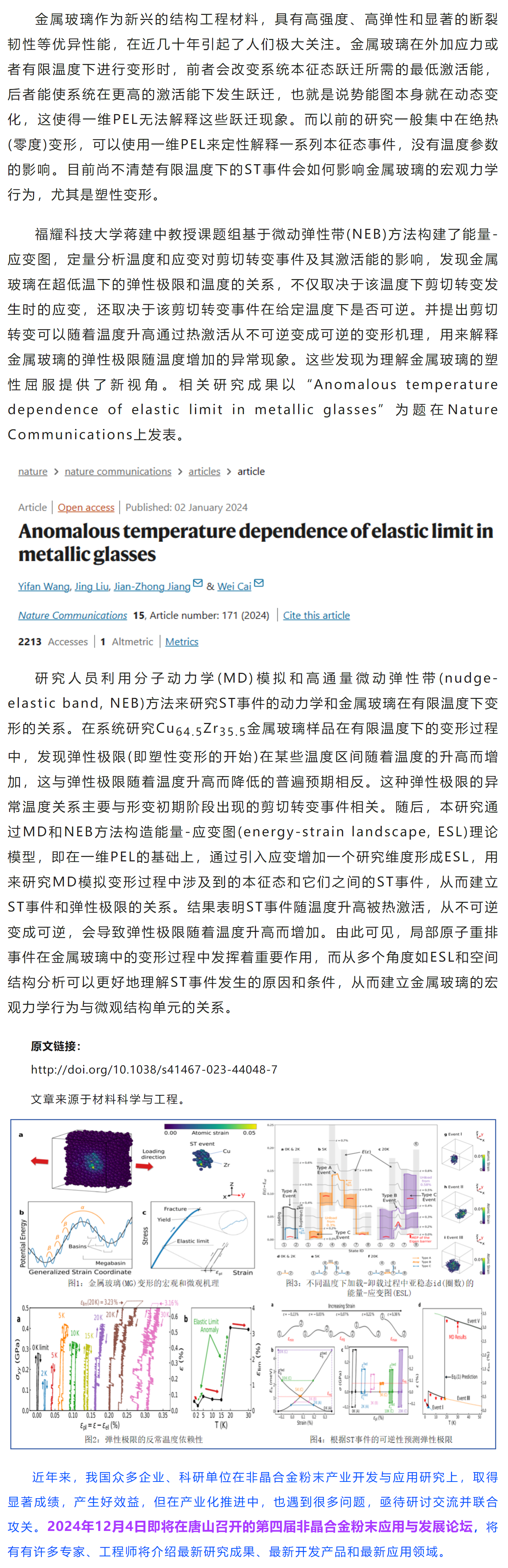 《Nat. Commun.》蒋建中等工作:金属玻璃弹性极限的异常温度依赖性