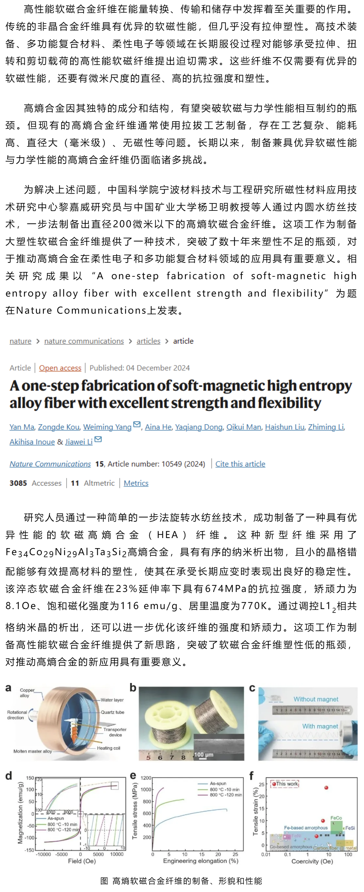 《Nat. Commun.》黎嘉威、杨卫明等工作:在提高软磁合金纤维的塑性方面取得进展