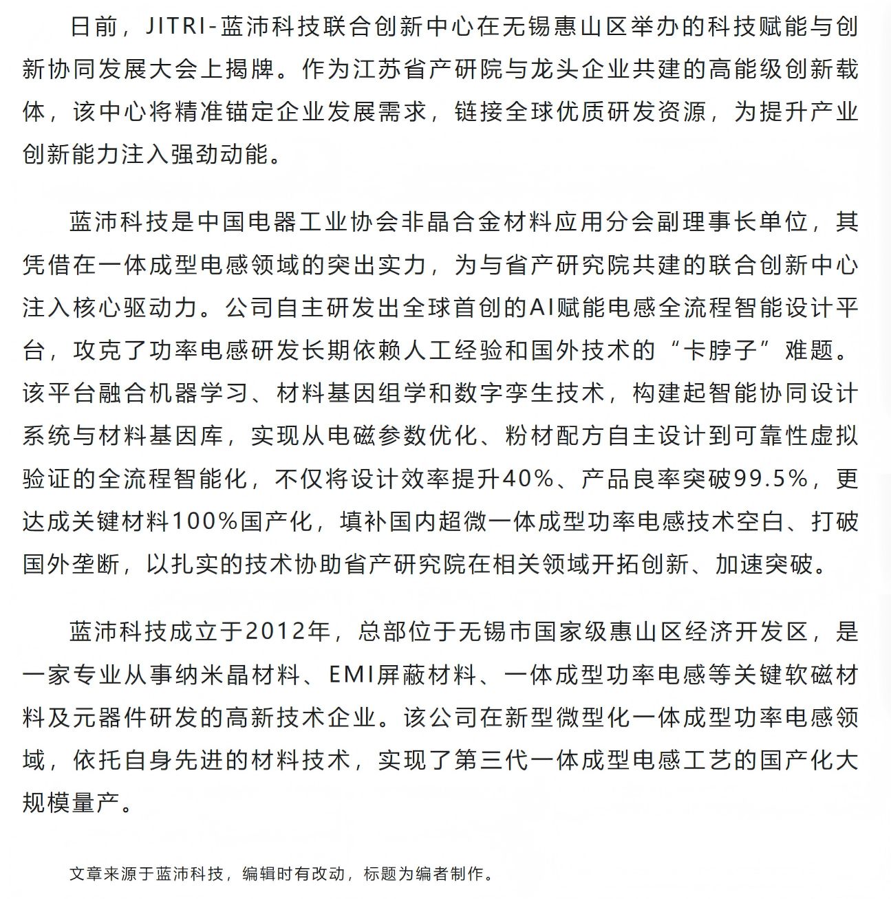 蓝沛科技:一体式电感关键材料100%国产 良率突破99.5%