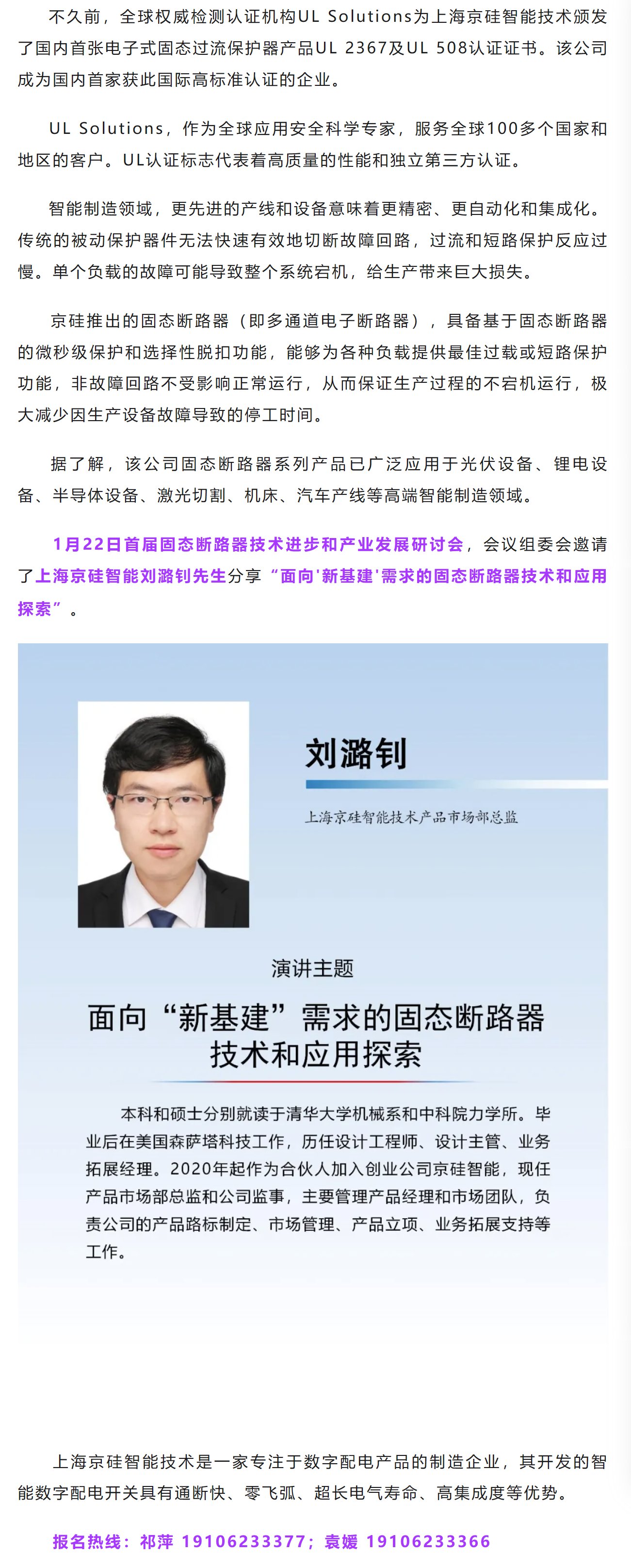 上海京硅:固态断路器国内首家获得UL双认证