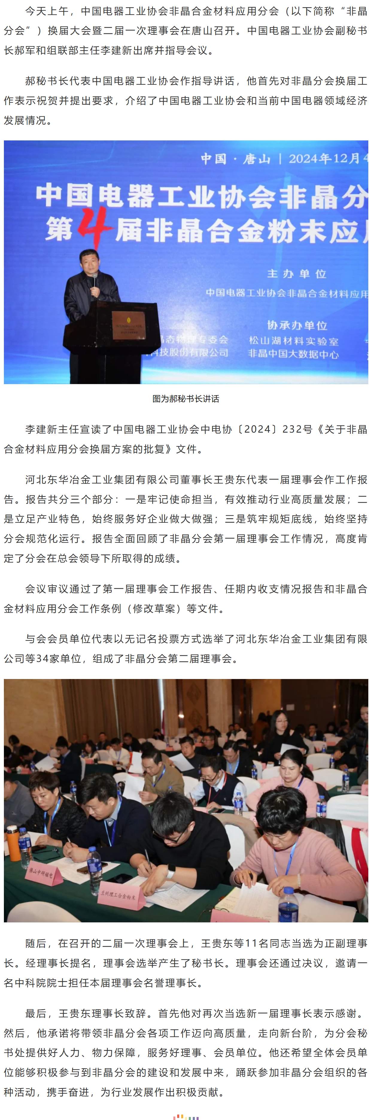 中国电器工业协会非晶合金材料应用分会换届大会暨二届一次理事会在唐山召开