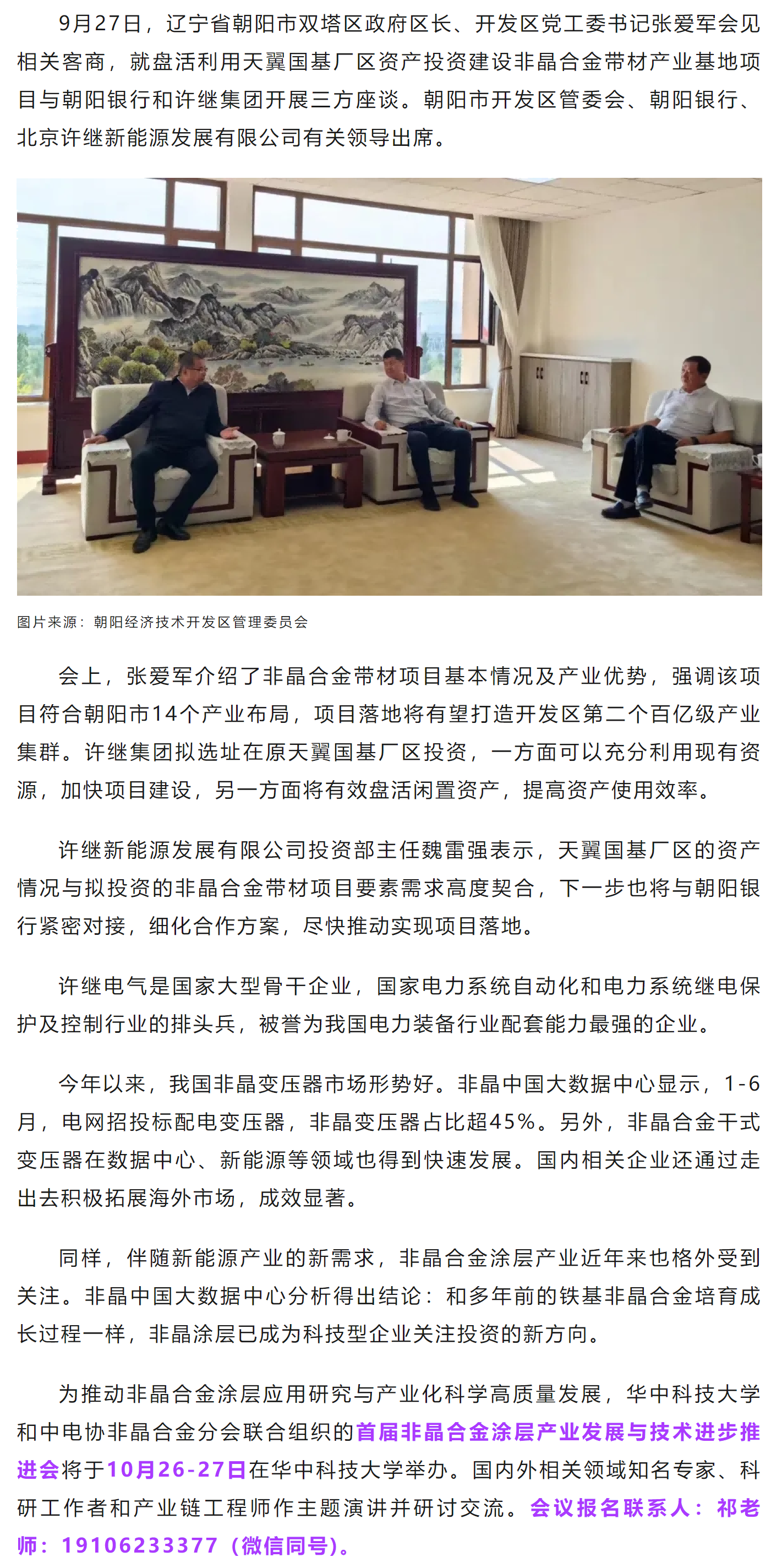许继集团拟在辽宁朝阳投资铁基非晶合金项目