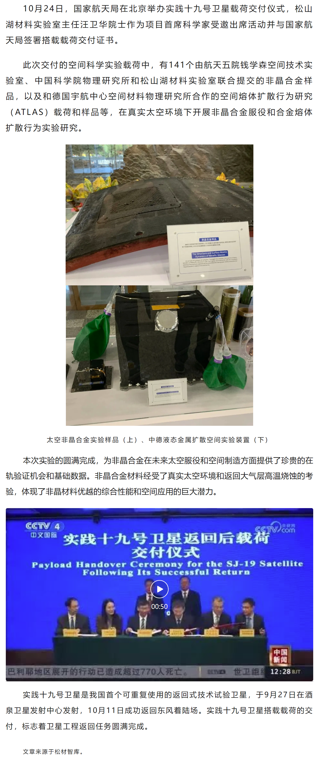 实践十九号卫星载荷交付——非晶合金及液态金属扩散空间实验顺利完成