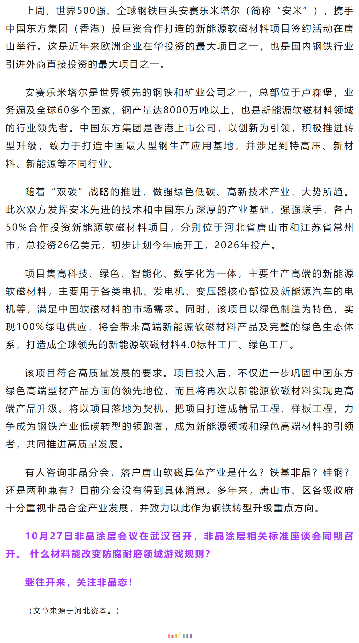 总投资26亿美元!是铁基非晶?安米携手中国东方(香港)合作新能源软磁材料项目落户唐山