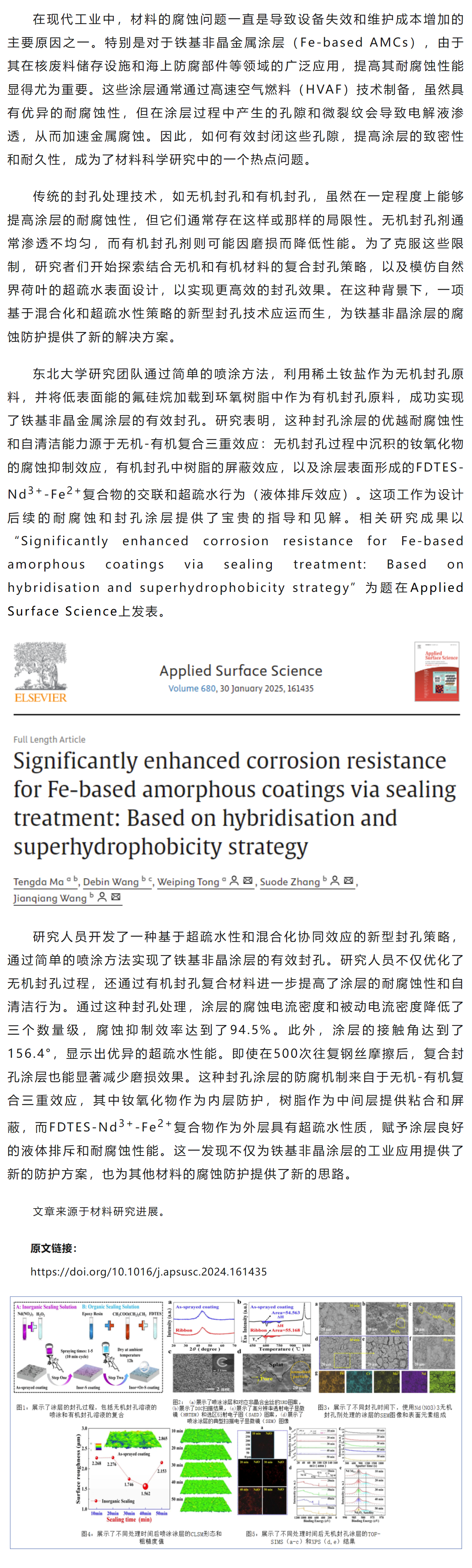 东北大学ASS:基于混合化和超疏水性策略显著提升铁基非晶涂层的封孔处理与耐蚀性研究