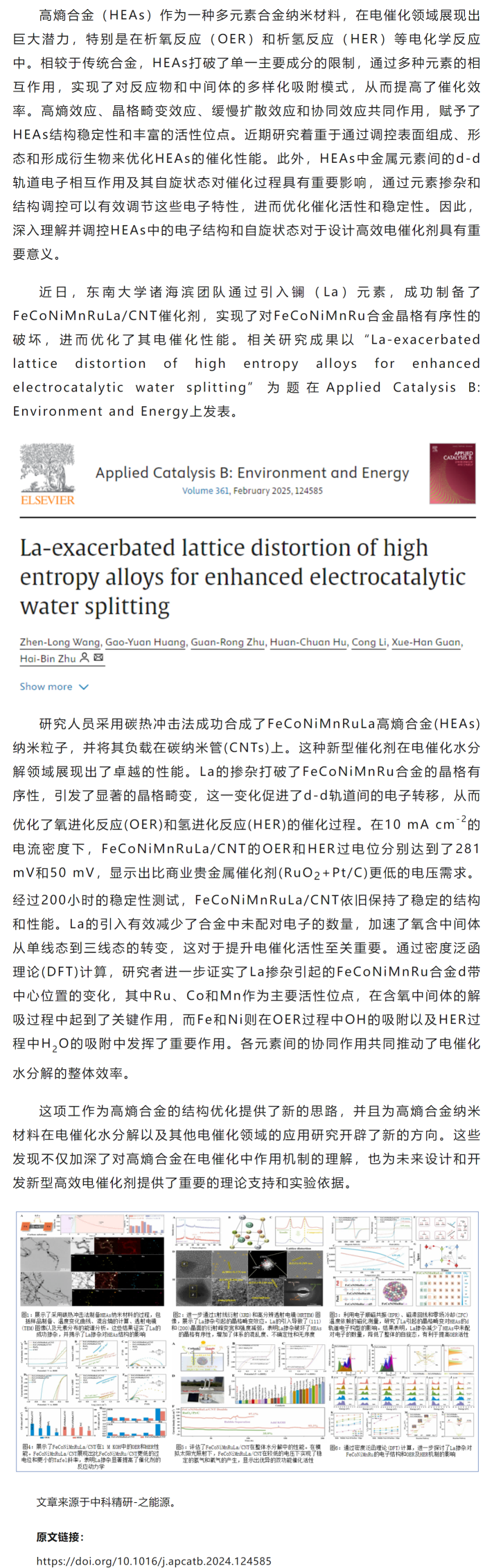 东南大学Appl. Catal. B: Environ.:稀土镧“牵手”高熵合金,电催化水分解迎来重大突破