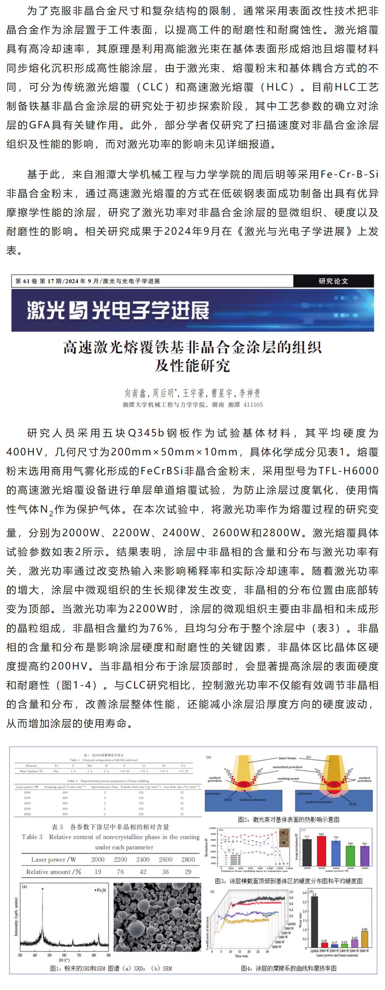 高速激光熔覆铁基非晶合金涂层的组织及性能研究