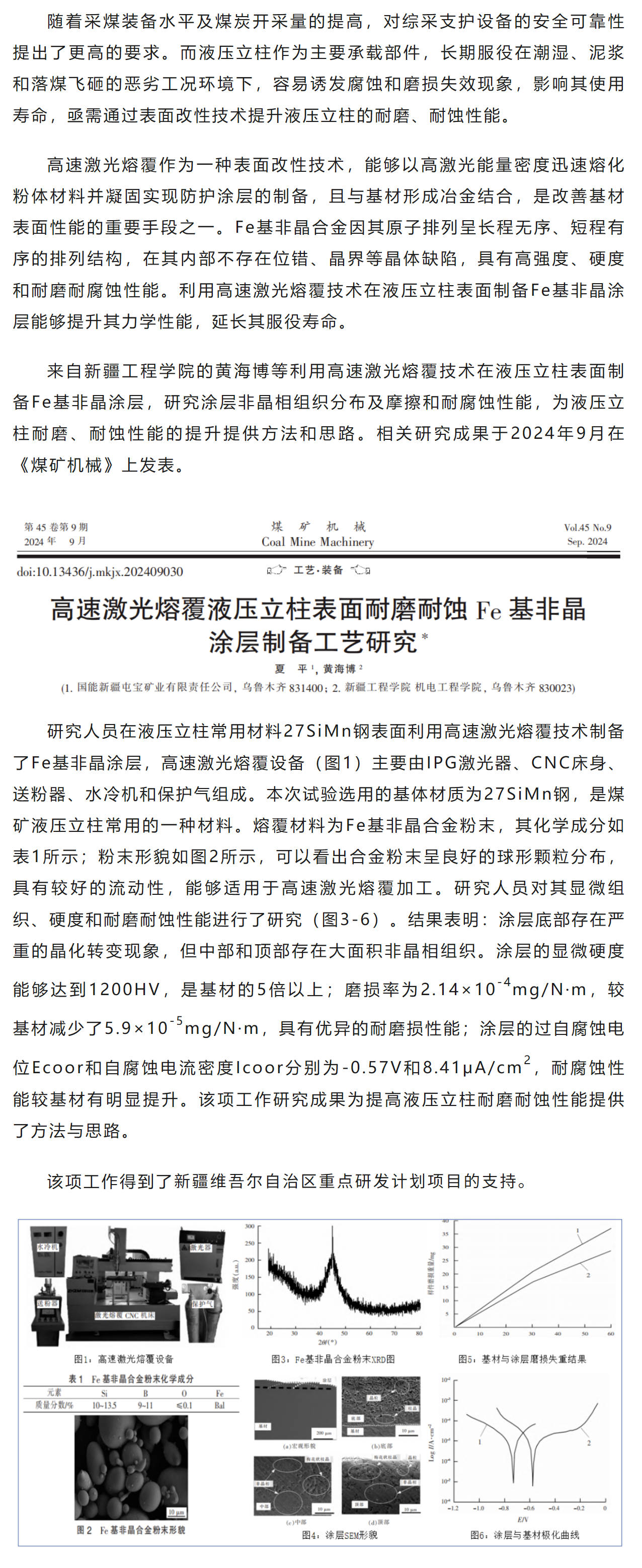 高速激光熔覆液压立柱表面耐磨耐蚀Fe基非晶涂层制备工艺研究