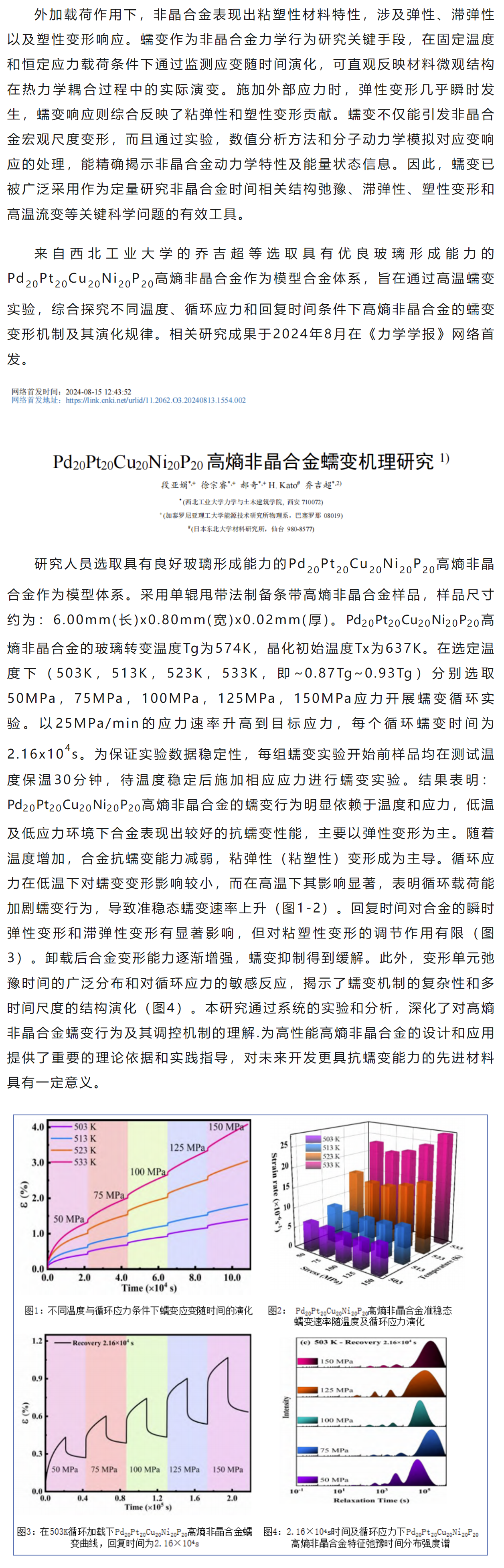 《力学学报》乔吉超等工作:Pd20Pt20Cu20Ni20P20高熵非晶合金蠕变机理研究