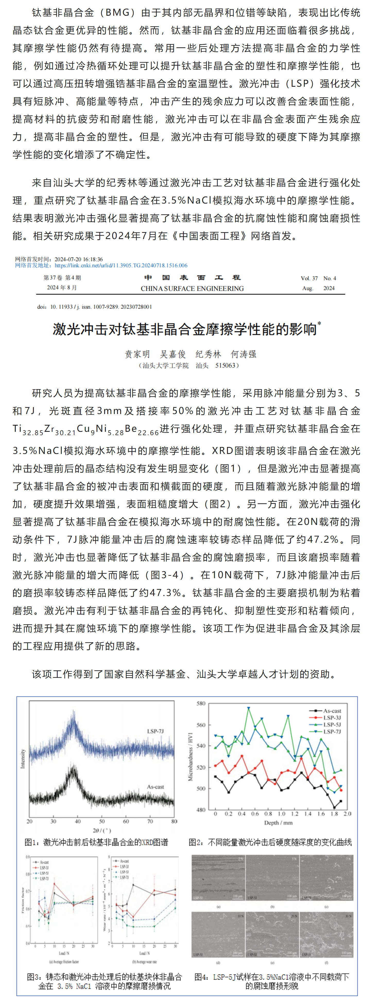 《中国表面工程》纪秀林等工作:激光冲击对钛基非晶合金摩擦学性能的影响