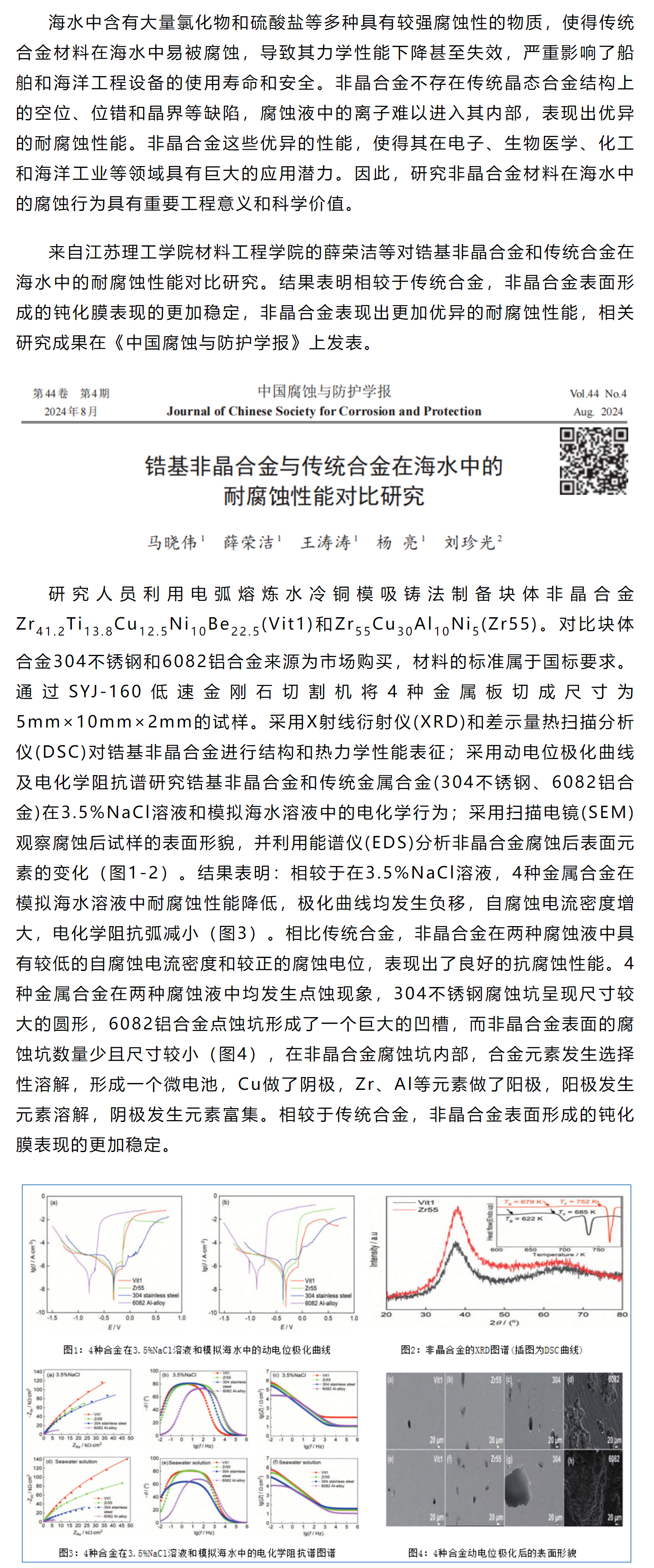 《中国腐蚀与防护学报》薛荣洁等工作:锆基非晶合金与传统合金在海水中的耐腐蚀性能对比研究