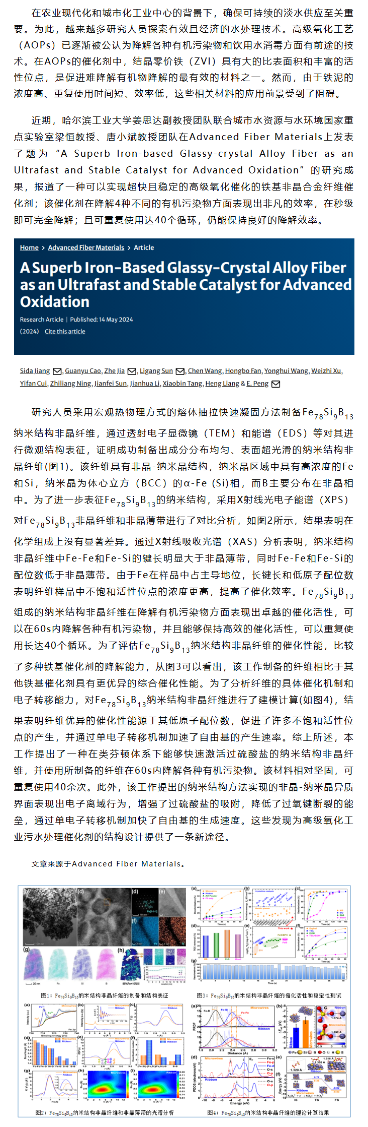 《Adv Fiber Mater》姜思达等工作:熔体抽拉制备铁基非晶合金纤维:快速激活过硫酸盐,高效净化工业污水