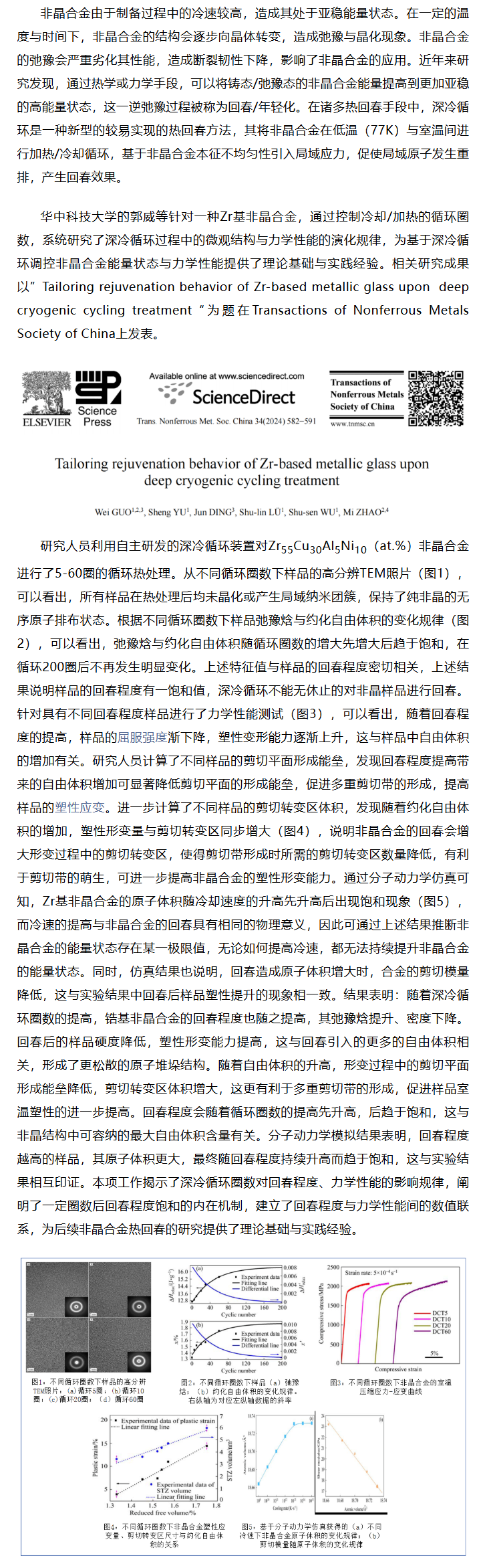 《TNMSC》郭威等工作:锆基金属玻璃在深冷循环处理中的回春行为调控