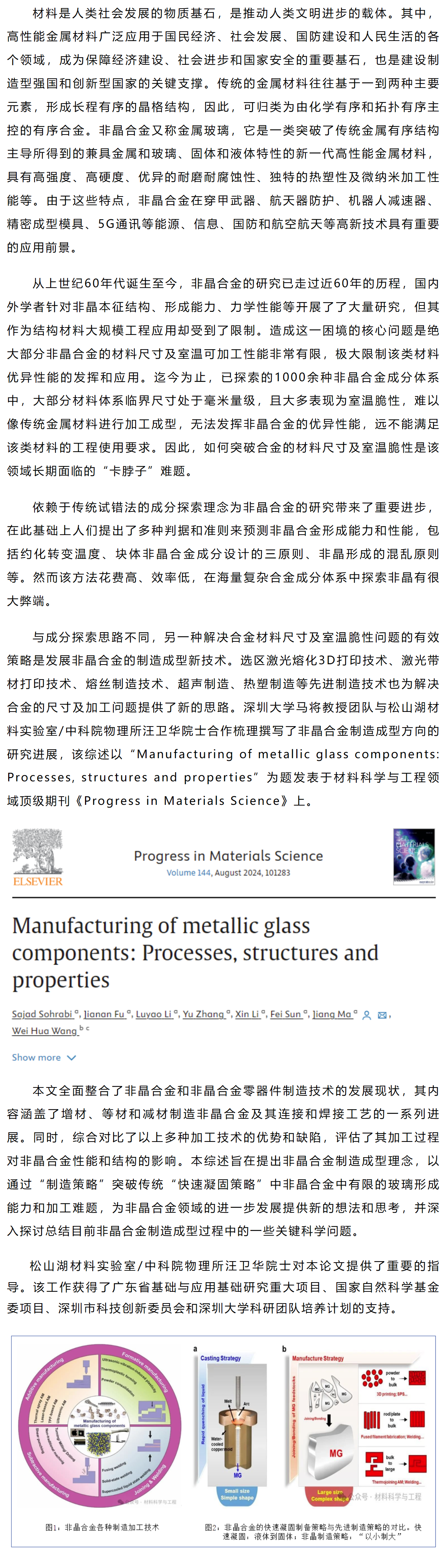 《Prog. Mater. Sci.》马将等工作:非晶合金制造成型综述