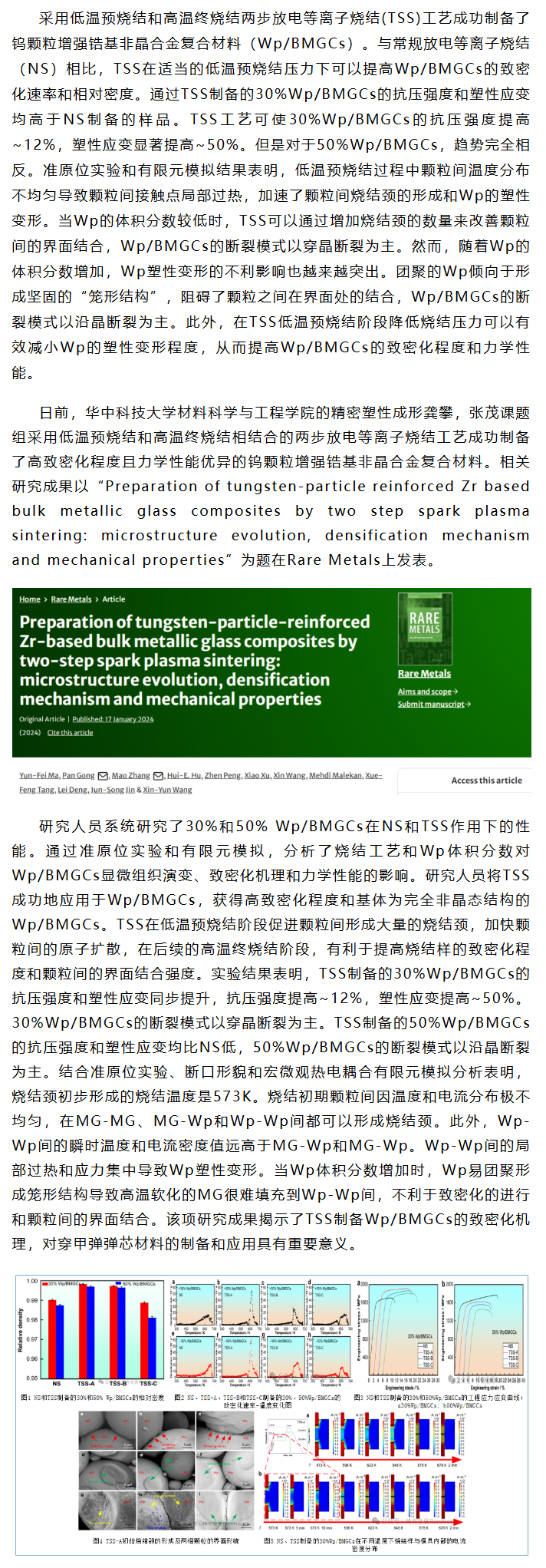 《Rare Metals》龚攀等工作:两步放电等离子烧结制备钨颗粒增强锆基非晶合金复合材料:微观结构演变、致密化机理及力学性能
