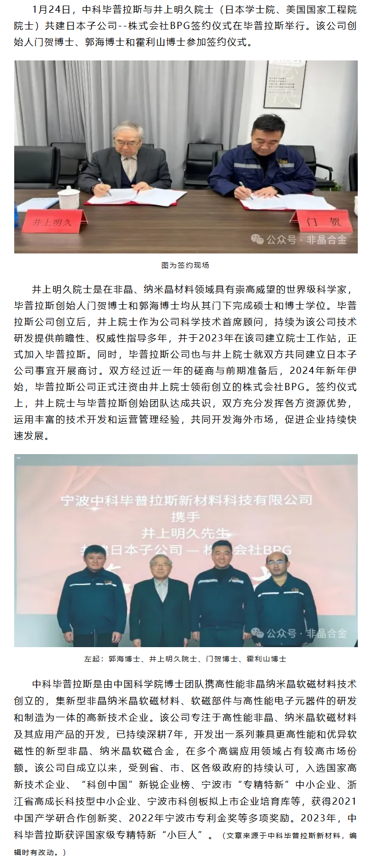井上明久与他的中国学生在华合资成立公司做非晶