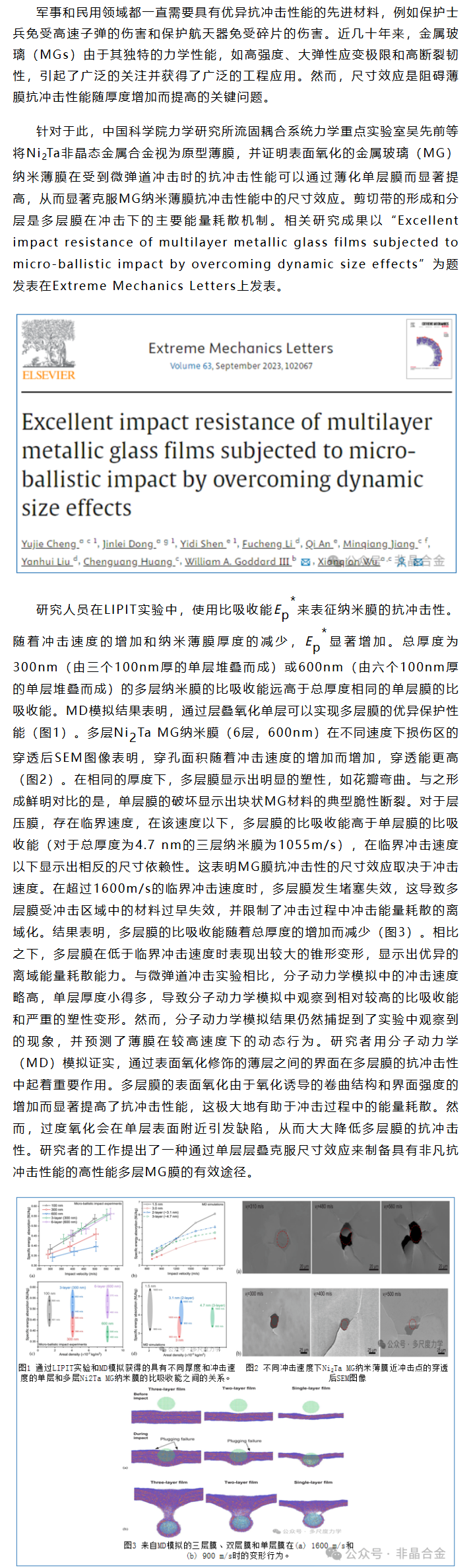 《EML》吴先前等工作:通过克服动态尺寸效应使多层金属玻璃薄膜在微弹道冲击下具有优异的抗冲击性能