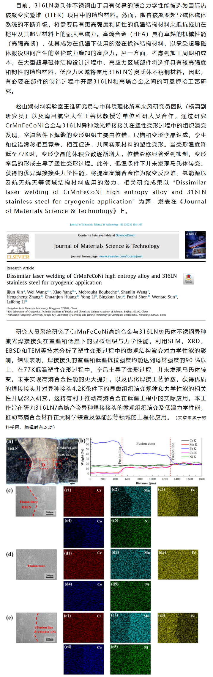 松山湖材料实验室《JMST》:磁约束核聚变超导磁体用316LN奥氏体不锈钢和高熵合金的异种激光焊接头组织与性能研究