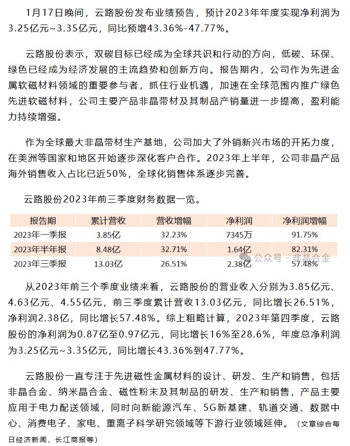 净利润3.25~3.35亿元!云路股份全年业绩预估报告出炉