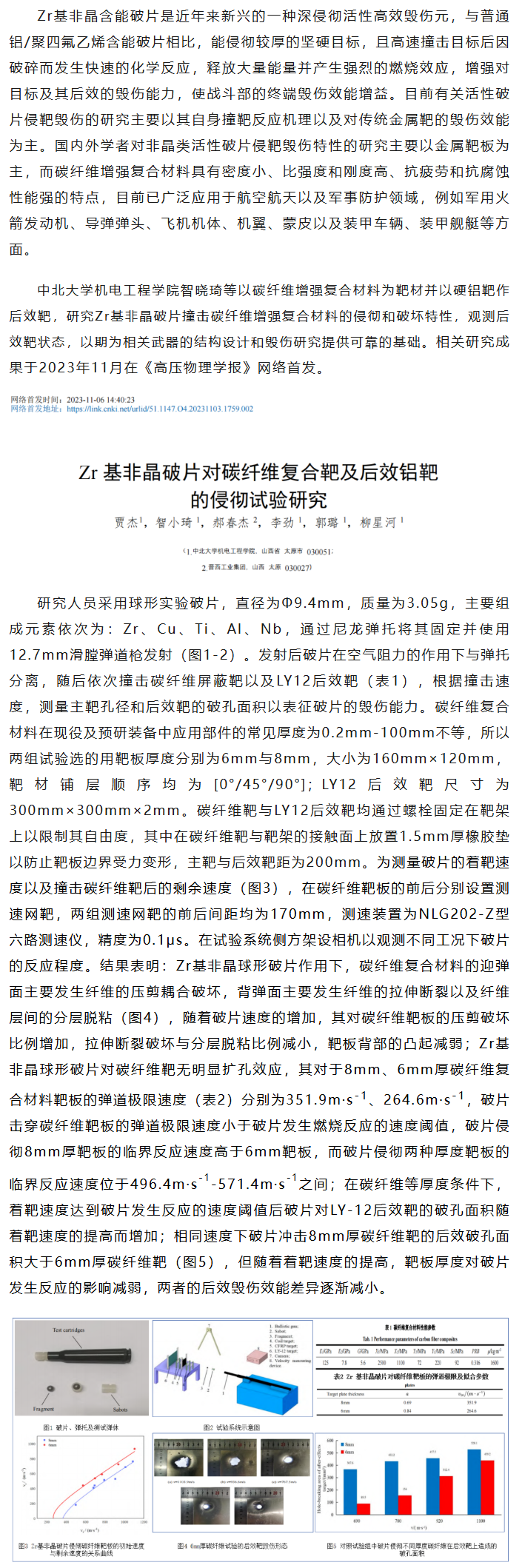 《高压物理学报》智小琦等工作:Zr 基非晶破片对碳纤维复合靶及后效铝靶的侵彻试验研究