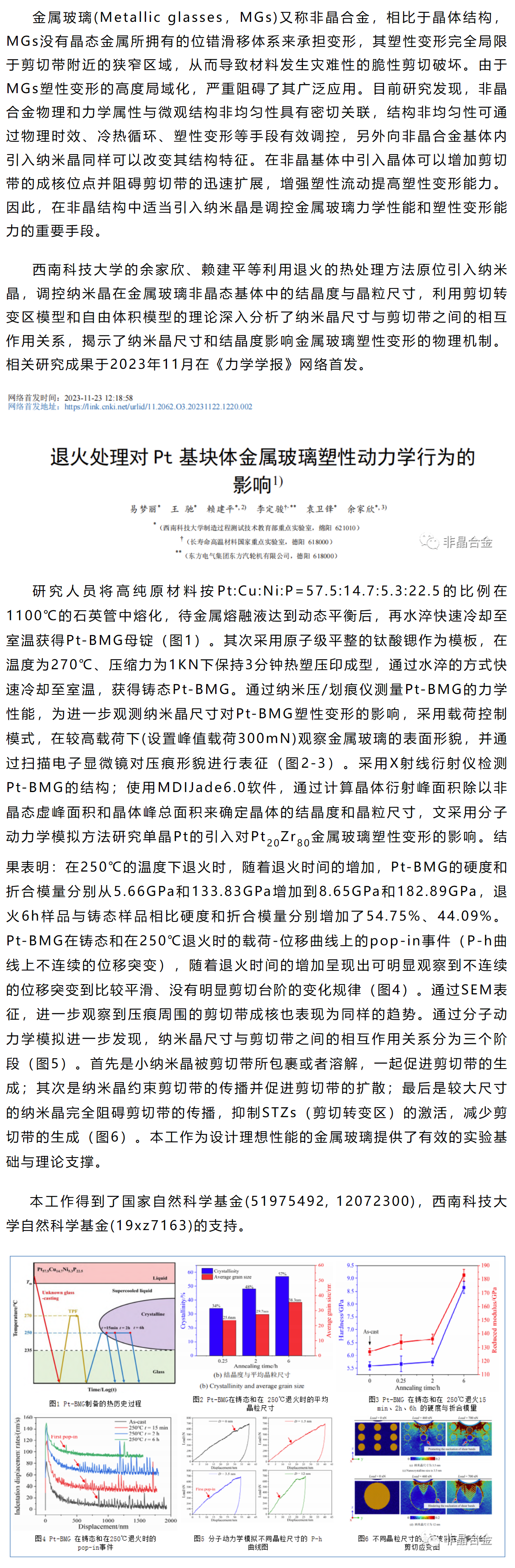 《力学学报》余家欣、赖建平等工作:退火处理对Pt基块体金属玻璃塑性动力学行为的影响