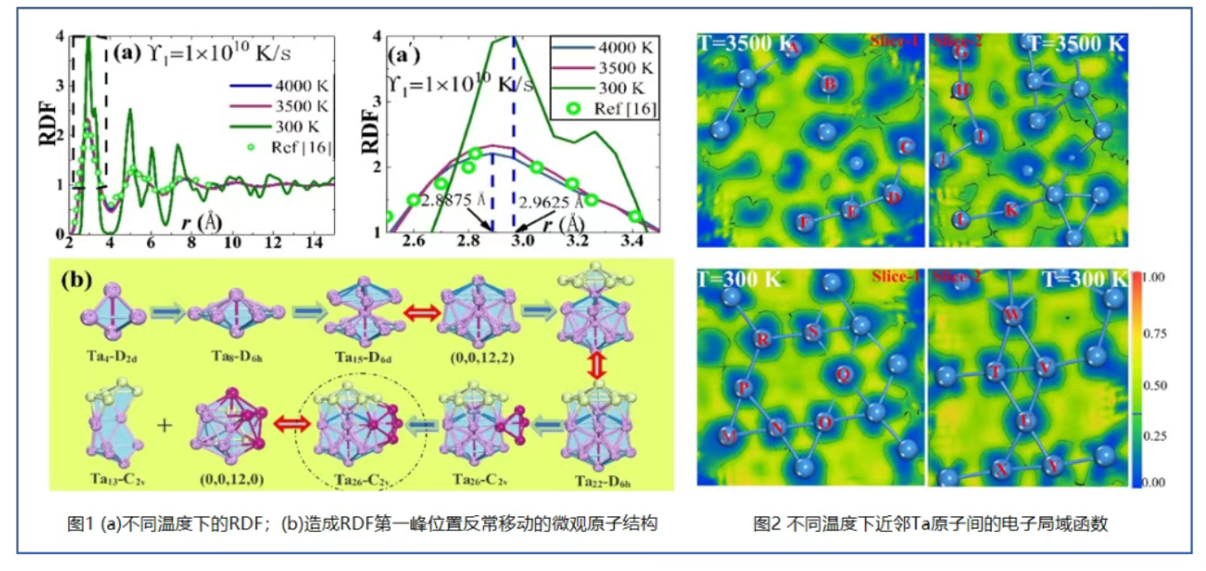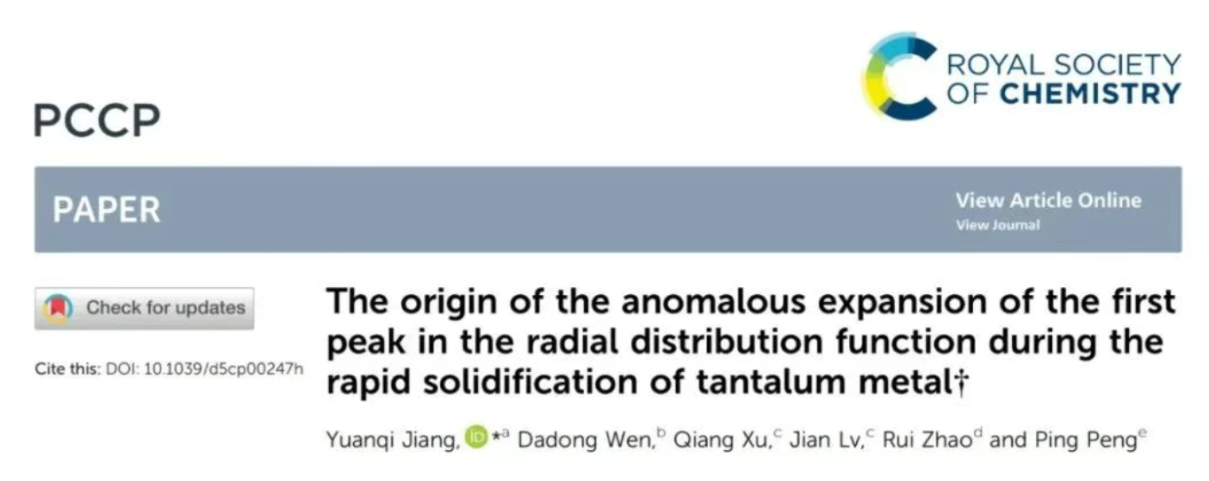 为了解决这一科学问题,并进一步阐明液态金属中径向分布函数(RDF)第一峰位置异常扩展的根本原因,来自南昌师范学院的蒋元祺教授与湖南工程学院文大东博士,吉林大学许强博士、吕健教授,新余学院赵瑞博士以及湖南大学彭平教授课题组密切合作,以单质难熔金属钽(Ta)在五种不同冷却速率下的快凝过程为研究对象,重点关注其快速淬火过程中RDF第一峰的演化行为与深层次物理机制。相关研究成果以“The origin of the anomalous expansion of the first peak in the radial distribution function during the rapid solidification of tantalum metal”为题在Physical Chemistry Chemical Physics上发表。
