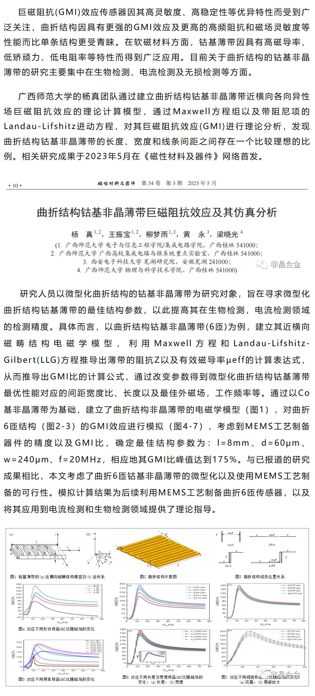 《磁性材料及器件》杨真等工作:曲折结构钴基非晶薄带巨磁阻抗效应及其仿真分析
