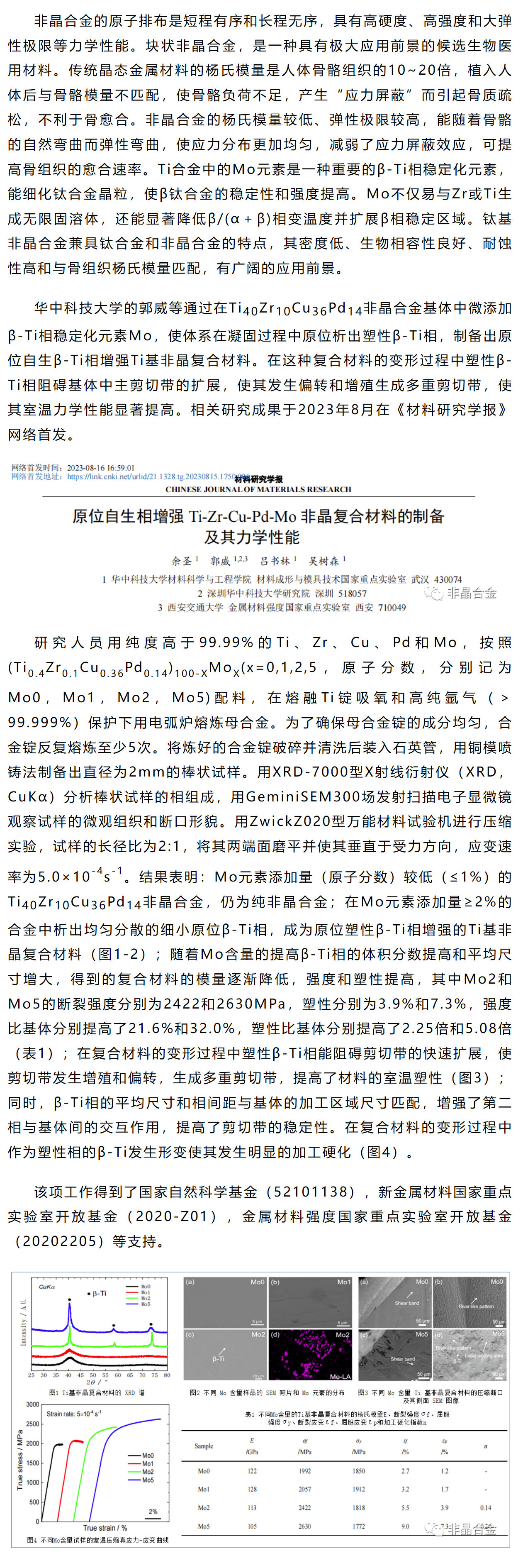 《材料研究学报》郭威等工作:原位自生相增强Ti-Zr-Cu-Pd-Mo非晶复合材料的制备及其力学性能