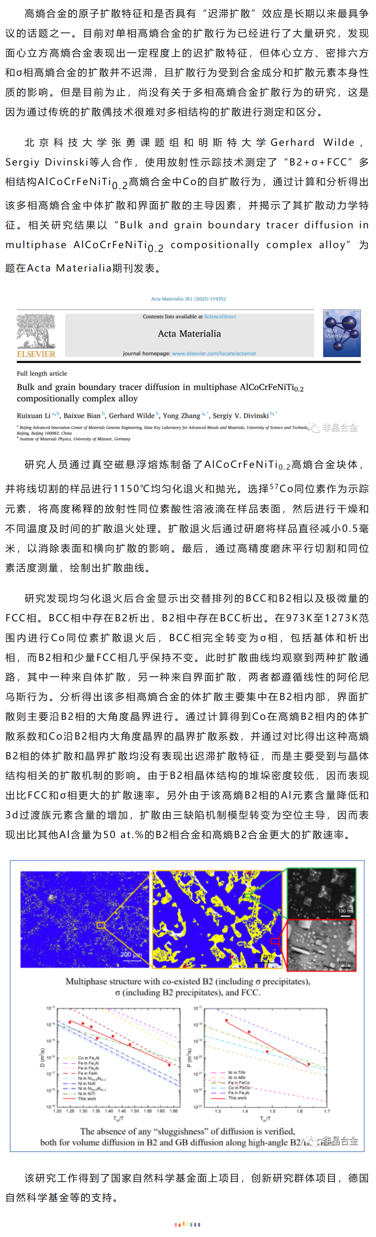 《ACTA MATER》张勇等工作:AlCoCrFeNiTi0.2成分复杂合金的体扩散和晶界扩散动力学研究