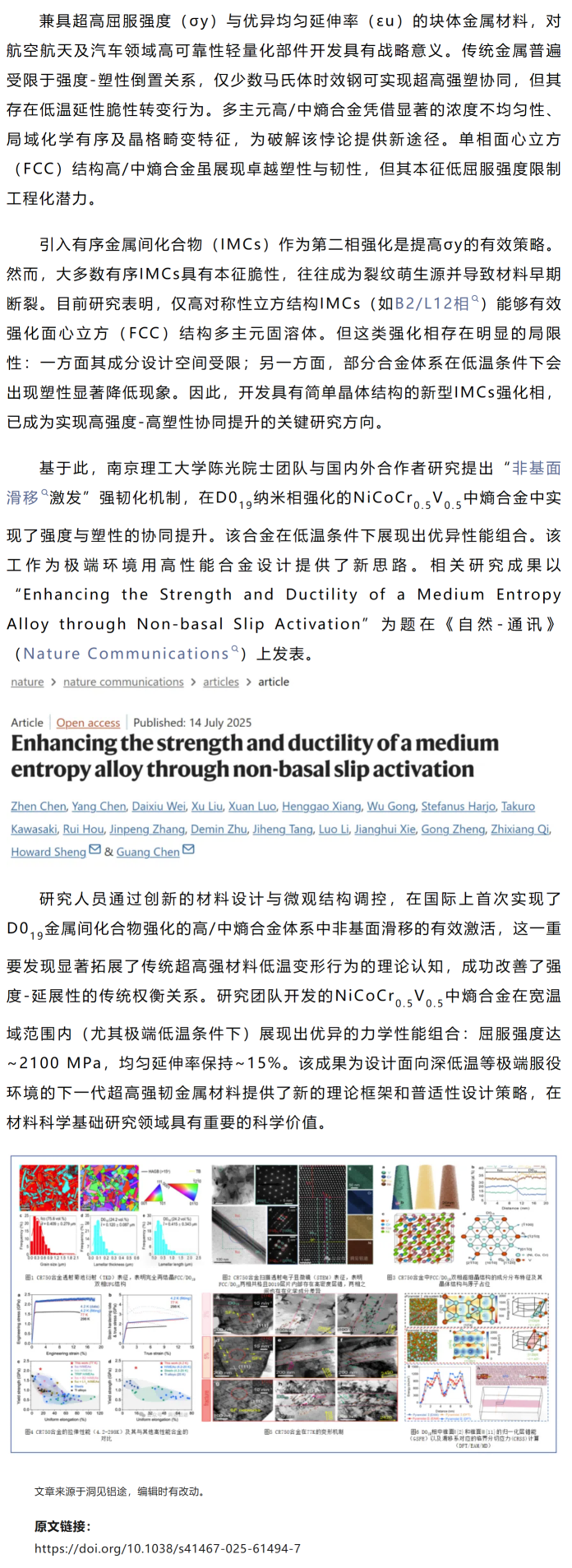 Nat. Commun.|陈光院士等工作:非基面滑移对中熵合金强度-延展性协同提升机制