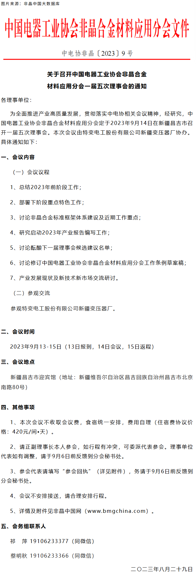 关于召开中国电器工业协会非晶合金材料应用分会一届五次理事会的通知