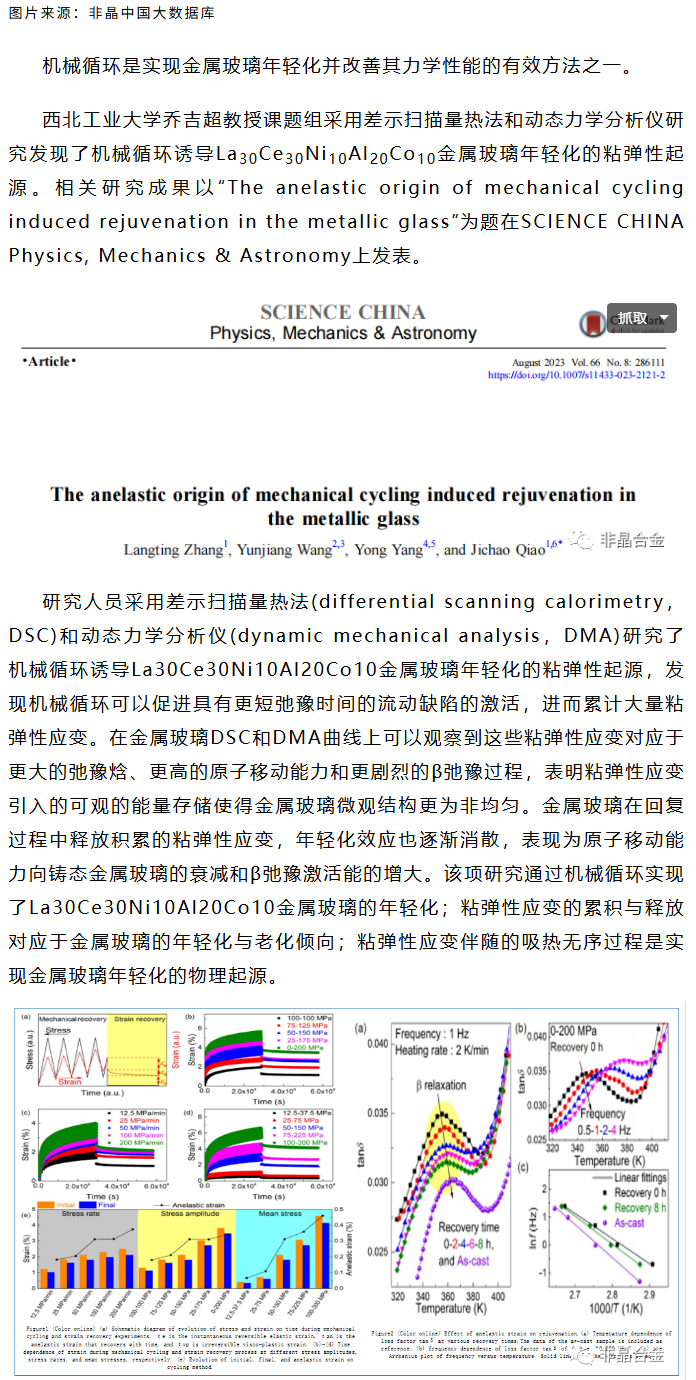 《SCPMA》乔吉超等工作:机械循环诱导金属玻璃年轻化的粘弹性起源