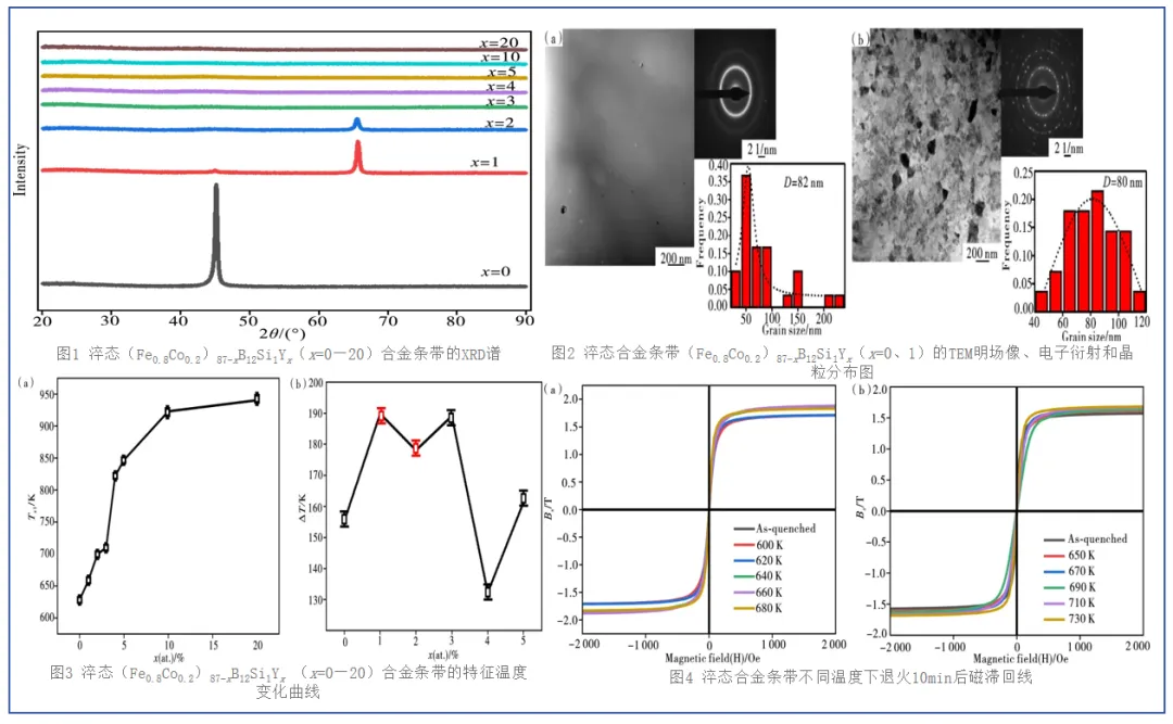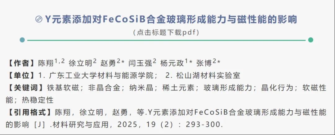 日前,广东工业大学杨元政教授团队、松山湖材料实验室张博研究员团队采用铜锟甩带快淬工艺,成功制备了高铁含量的Fe基非晶纳米晶合金(Fe0.8Co0.2)87-xSi1B12Yx(x=0—20),同时研究了Y元素的添加量对该合金玻璃形成能力、晶化行为及退火前后磁性能的影响。相关研究成果以“Y元素添加对FeCoSiB合金玻璃形成能力与磁性能的影响”为题在《材料研究与应用》上发表。