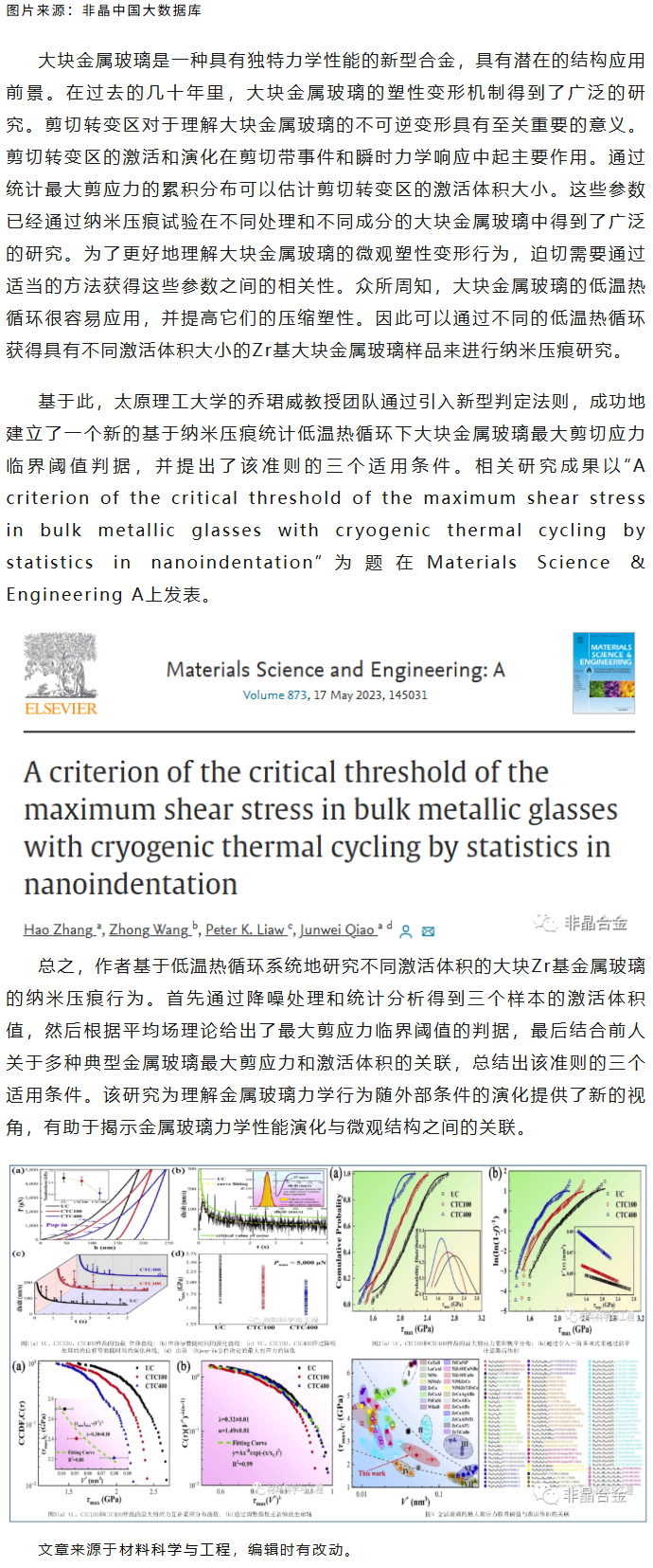 《MSEA》乔珺威等工作:基于纳米压痕统计低温热循环下大块金属玻璃最大剪切应力临界阈值