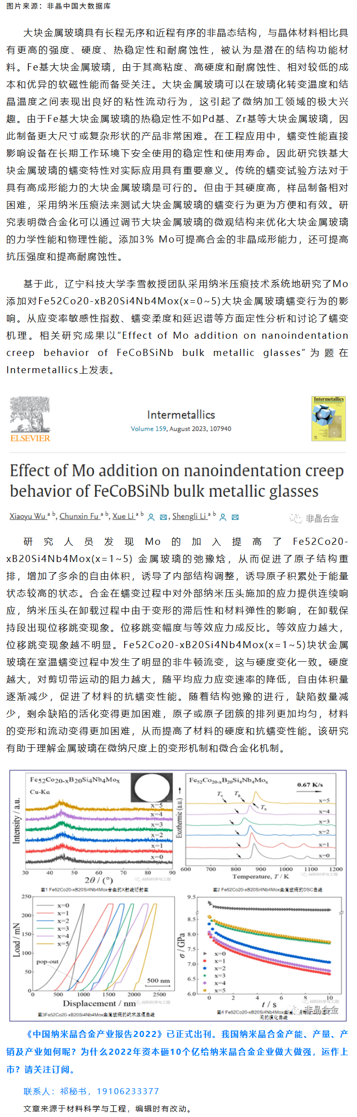 《Intermetallics》李雪等工作:Mo添加对块体金属玻璃纳米压痕蠕变行为影响