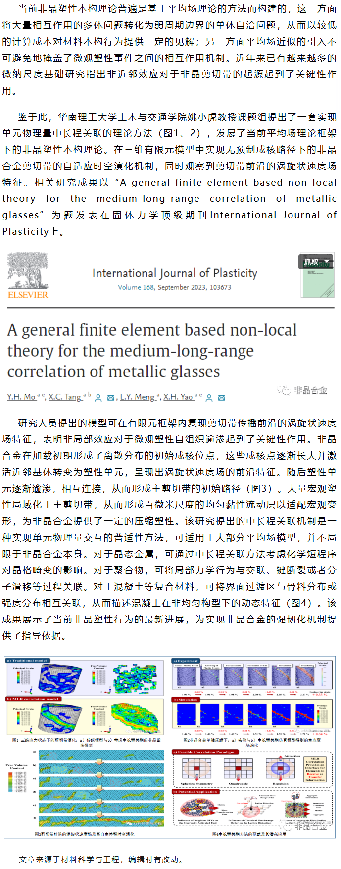 《IJP》姚小虎等工作:考虑非近邻效应的中长程关联非晶塑性本构模型