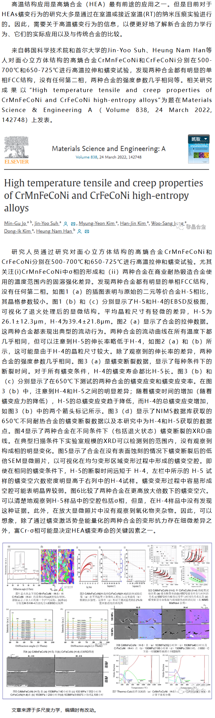 《MSEA》Jin-Yoo Suh、Heung Nam Han等工作:两种高熵合金的高温拉伸和蠕变性能