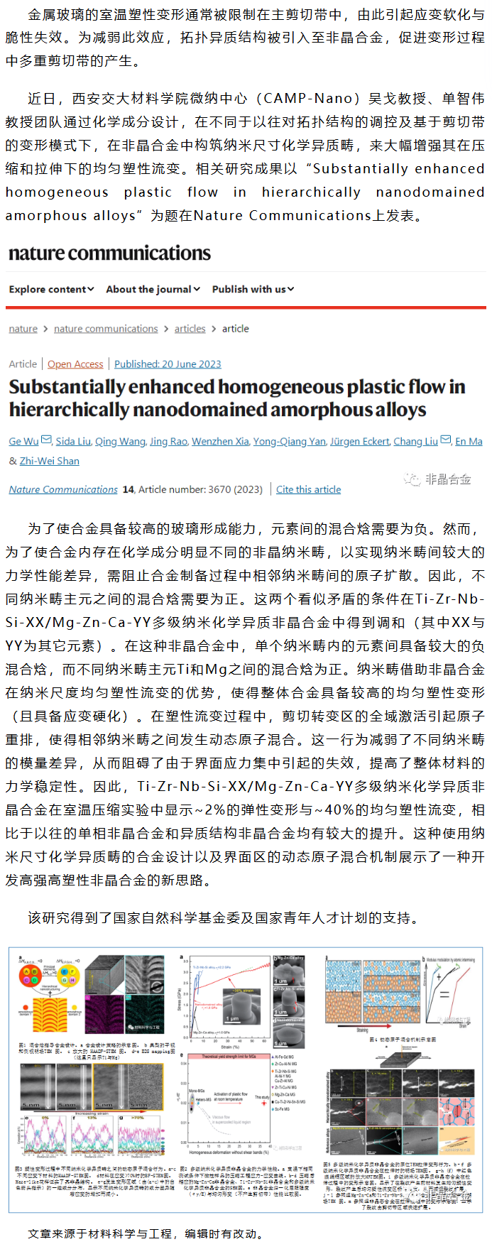 《Nat.Commun.》吴戈、刘畅等工作:多级纳米化学异质非晶合金实现室温大塑性均匀流变