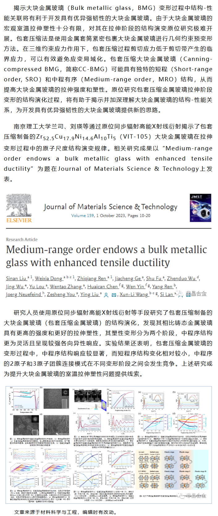 《JMST》兰司、刘瑛等工作:中程有序结构赋予大块金属玻璃拉伸强韧性