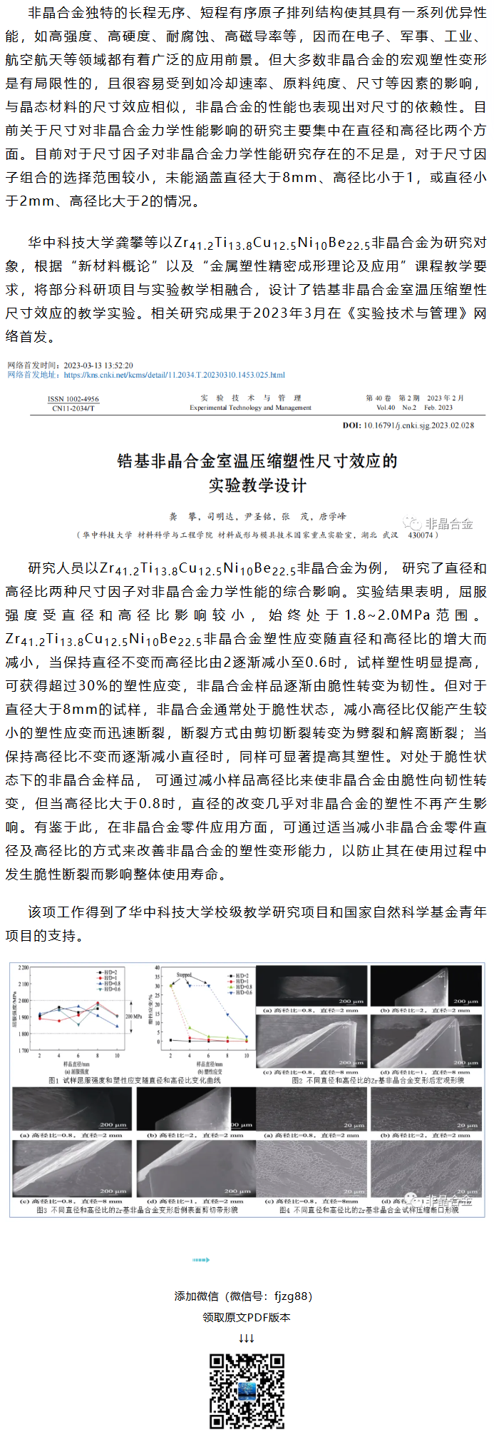 《实验技术与管理》龚攀等工作:锆基非晶合金室温压缩塑性尺寸效应的实验教学设计
