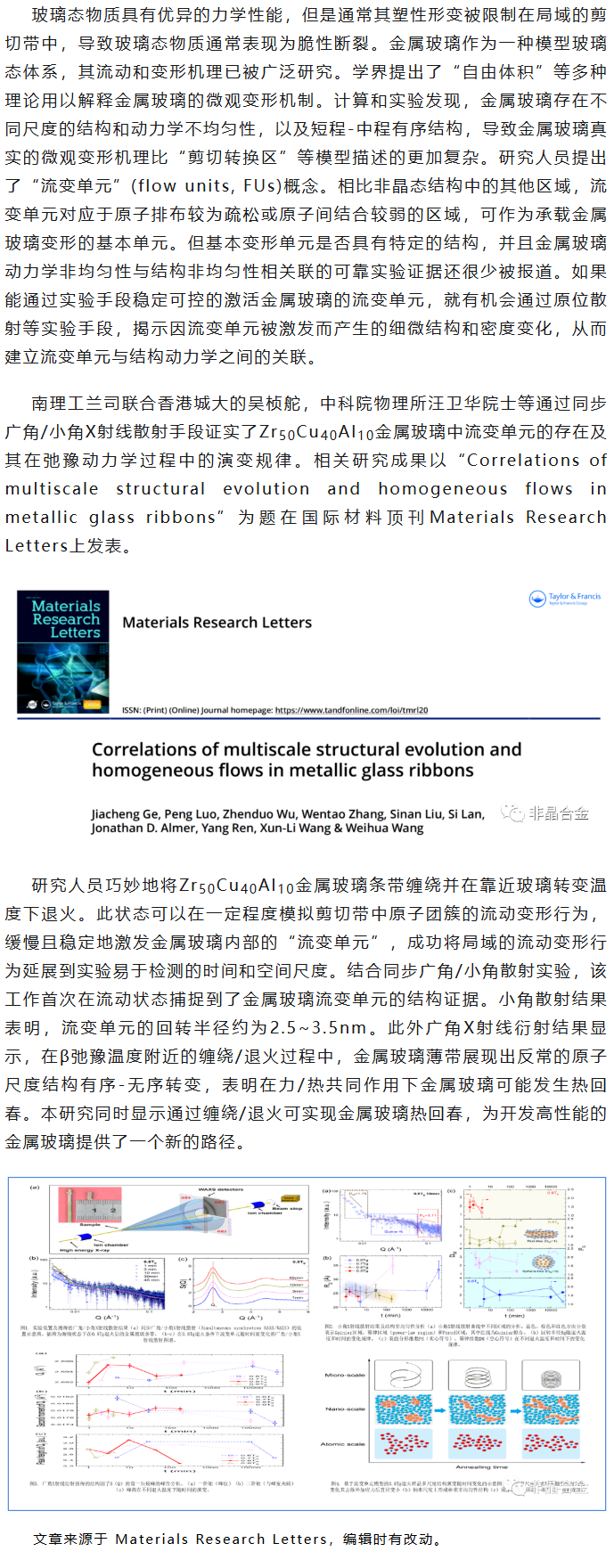《MATER RES LETT》兰司等工作:通过同步广角/小角X射线散射揭示金属玻璃条带多尺度结构演化与均匀流动的关联