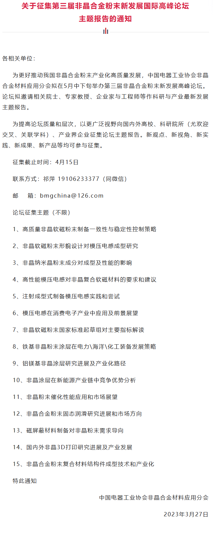 关于征集第三届非晶合金粉末新发展高峰论坛主题报告的通知