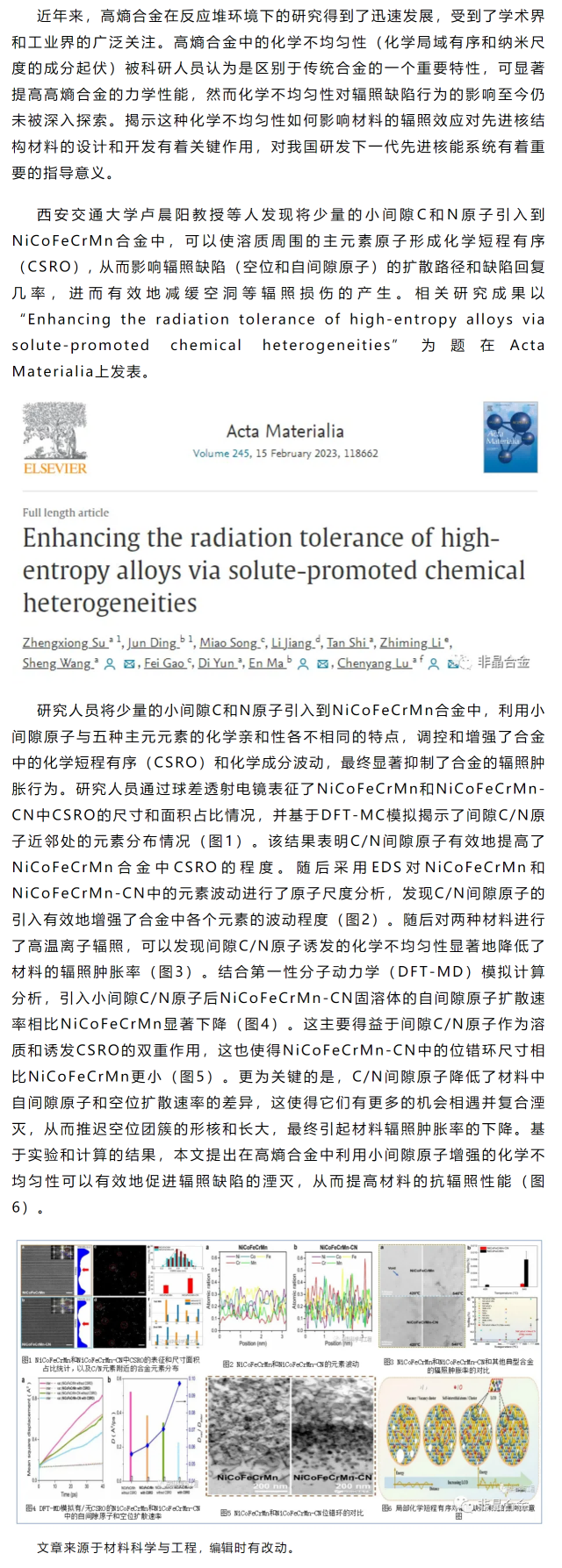 《Acta Materialia》王盛、卢晨阳、马恩等工作:化学不均匀性提升高熵合金抗辐照性能
